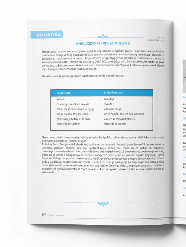 Each lesson contains a separate „Reader“ section that thematically follows an excerpt from contemporary Serbian literature in the form of poems, short stories, or excerpts from prose works, such as various anthropological or travelogue texts.