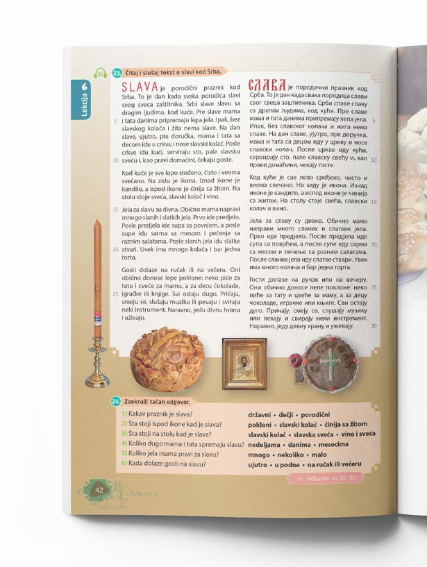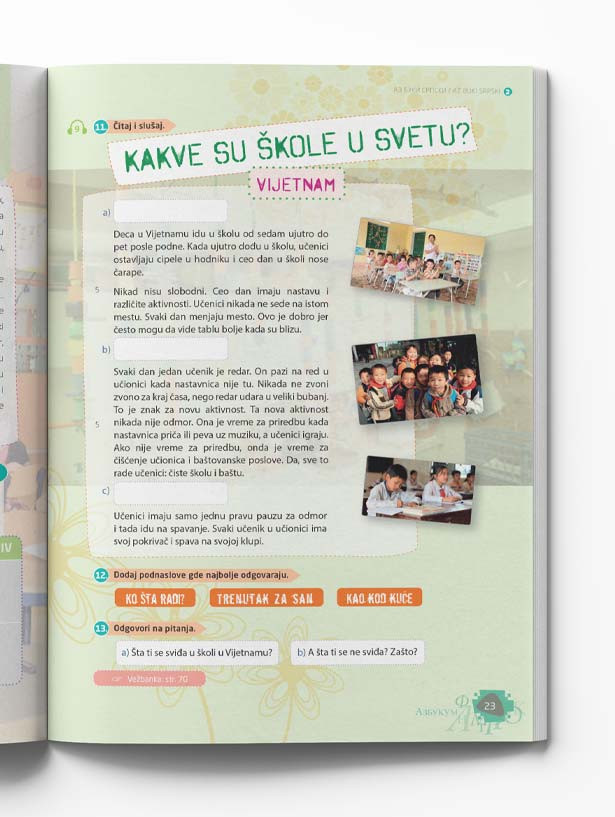 Posebno mesto u udžbeniku zauzima Čitanka sa nizom tekstova i pratećih vežbi namenjenih bogaćenju vokabulara. Tu su zanimljive priče o Srbiji i vršnjacima koji su izuzetni po nekom od svojih talenata.