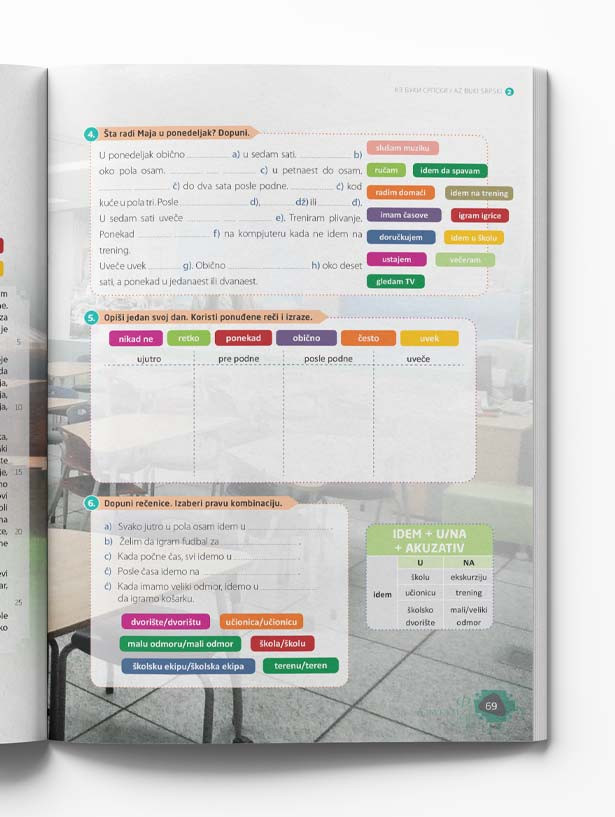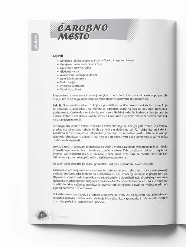 Udžbenik ima osam lekcija koje su pune zabavnih tema, zanimljivih igara i izazovnih zadataka. Svaka lekcija se sastoji od tekstova za čitanje, pasaža za slušanje, vežbi za razumevanje pročitanog i usvajanje novih reči i izraza.  Tekstovi iz lekcija su dati u ekavskoj i ijekavskoj varijanti standardnog srpskog jezika.