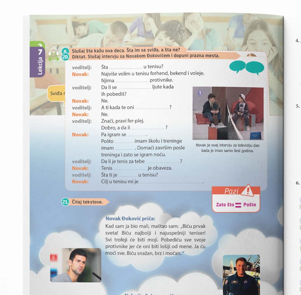 20. Diktat. Slušaj intervju sa Novakom Đokovićem i dopuni prazna mesta.