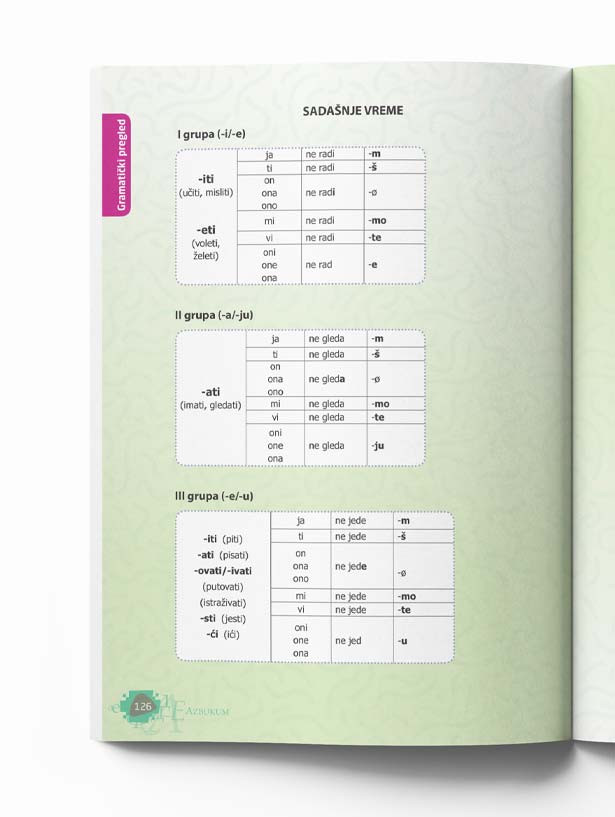 Pregled gramatike dat je kao zaseban deo udžbenika i donosi jasno prikazana pravila čiji se primeri već nalaze u lekcijama.