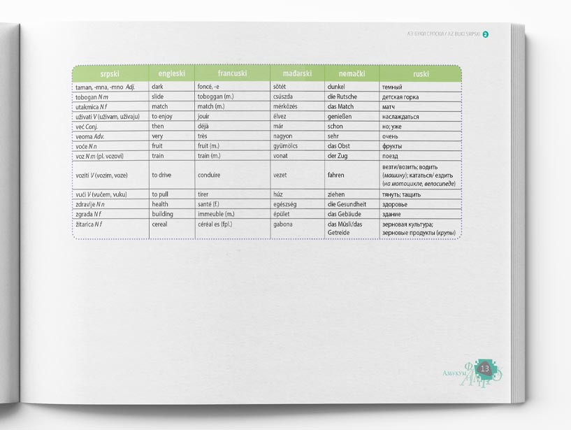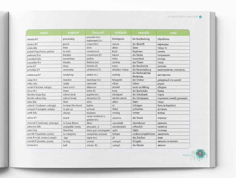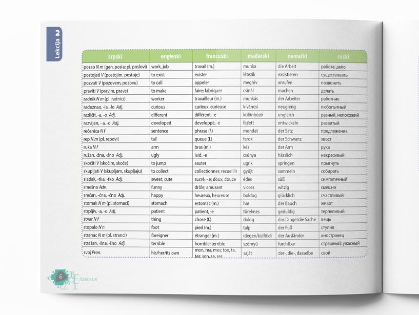 Udžbenik ima rečnik sa prevodom reči iz lekcija na pet jezika: engleski, ruski, nemački, francuski i mađarski.