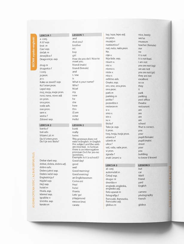 Rečnik sa spiskom reči po lekcijama nudi prevod na engleski, nemački, ruski, francuski i mađarski jezik i nalazi se u dodatku koji se može preuzeti sa internet adrese date na unutrašnjim koricama udžbenika.