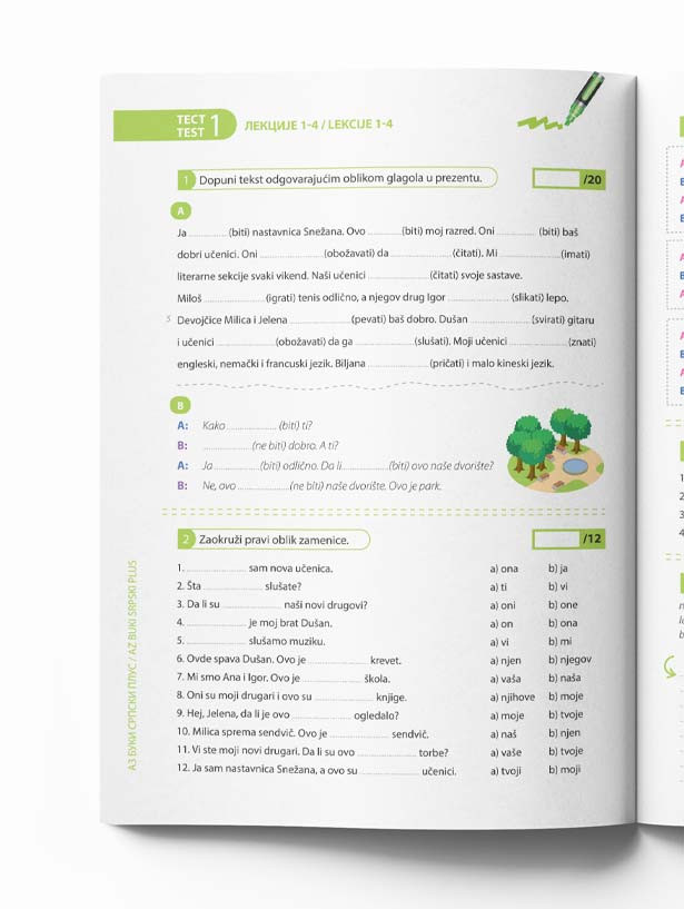 Nakon svake druge lekcije postoji revizorni test za proveru znanja i stepena napretka. Udžbenik nudi ukupno četiri testa, do kojih se dolazi putem linka datog na koricama.
